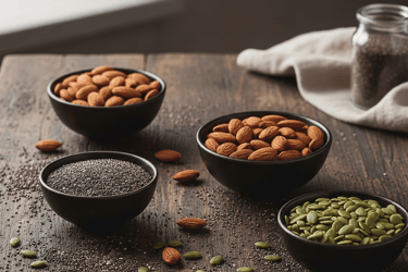 Mandeln, Chiasamen und Kürbiskerne liefern Protein, gesunde Fette und Magnesium. Magnesium ist wichtig für die Muskelfunktion und reduziert Steifheit, sodass die Muskeln flexibel und unterstützend bleiben.
